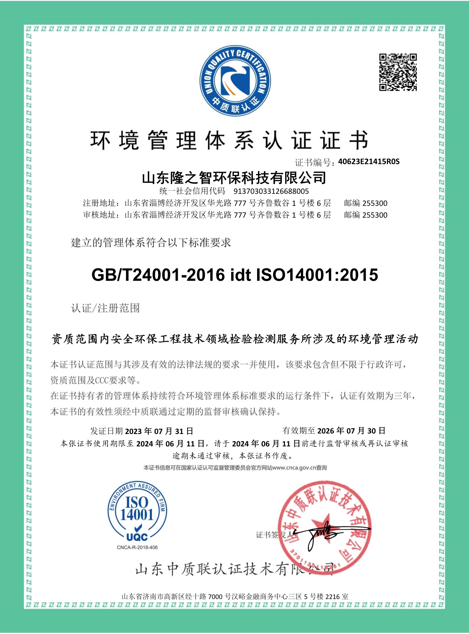 環(huán)境管理體系認(rèn)證證書(shū)