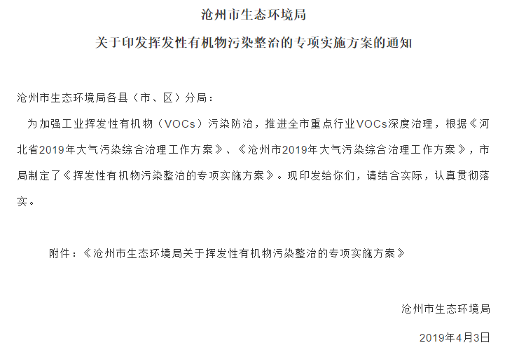 2019/04/05[閱讀原文]為深入開(kāi)展揮發(fā)性有機(jī)物(以下簡(jiǎn)稱“VOCs”)污染綜合整治,進(jìn)一步改善環(huán)境空氣質(zhì)量,依據(jù)市政府《滄州市2019年大氣污染綜合治理工作方案》和VOCs排放控制有關(guān)要求,制定本專項(xiàng)實(shí)施方案。