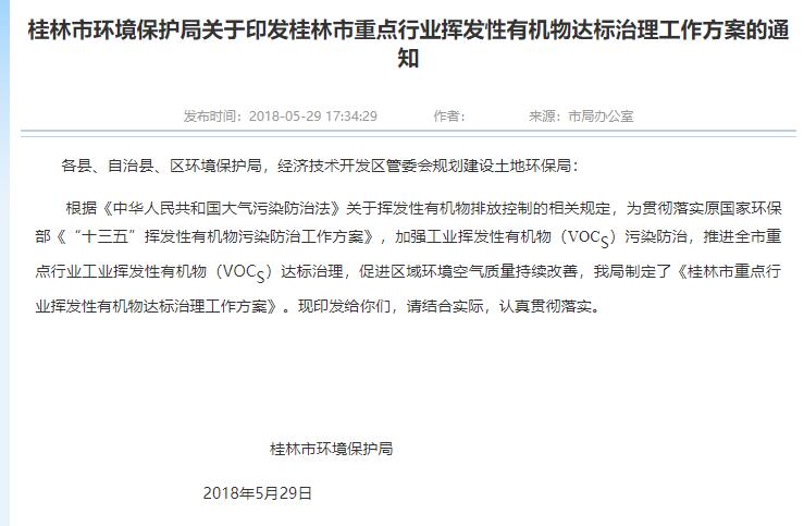 日前,廣西桂林印發(fā)《桂林市重點行業(yè)揮發(fā)性有機物達標治理工作方案》。全文如下: