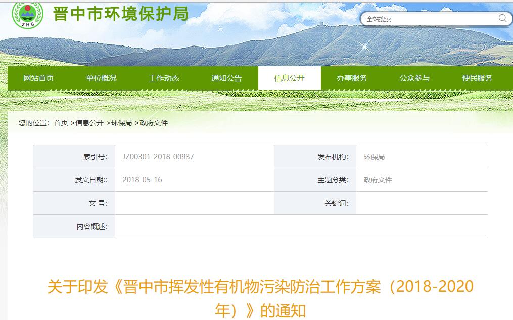 2018/07/05[閱讀原文]為持續(xù)改善全市環(huán)境空氣質量,遏制臭氧污染,全面加強揮發(fā)性有機物(vocs)污染防治工作,強化重點行業(yè)污染物減排,促進重點行業(yè)綠色轉型發(fā)展,依據(jù)六部委聯(lián)合印發(fā)的《“十三五”揮發(fā)性有機物污染防治工作方案》(環(huán)大氣〔2017〕121號)和山西省大氣防辦印發(fā)的《山西省揮發(fā)性有機物污染防治工作方案(2018-2020年)》(晉氣防辦〔2018〕17號)相關要求,結合我市實際,特制定本工作方案。