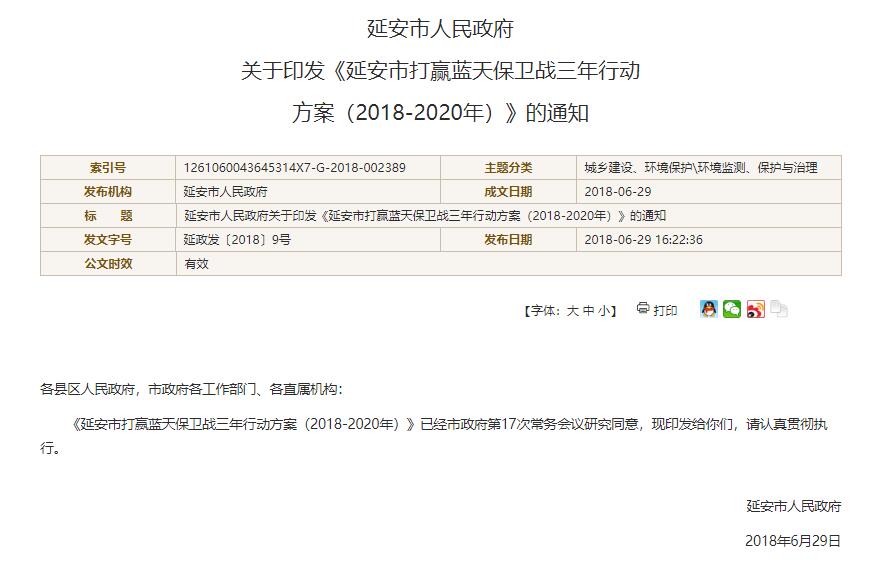 2018/07/24[閱讀原文]為進一步深化大氣污染治理工作,全面提高延安市環(huán)境空氣質量,依據(jù)《陜西省大氣污染防治條例》、《陜西省鐵腕治霾打贏藍天保衛(wèi)戰(zhàn)三年行動方案(2018-2020年)》、《陜西省鐵腕治霾打贏藍天保衛(wèi)戰(zhàn)2018年工作要點》要求,制定本方案。