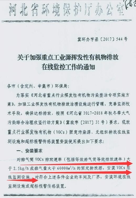 2017/12/15[閱讀原文]日前,保定環(huán)保局轉(zhuǎn)發(fā)河北省環(huán)保廳關(guān)于加強(qiáng)重點(diǎn)工業(yè)源揮發(fā)性有機(jī)物排放在線(xiàn)監(jiān)控工作的通知(冀環(huán)辦字函〔2017〕544號(hào))。全文如下: