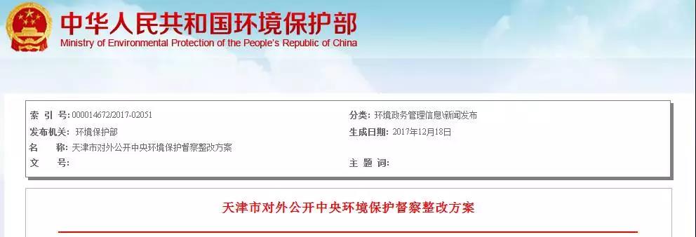 2017/12/20[閱讀原文]18日從環(huán)保部官網(wǎng)獲悉,天津等7省(市)公開(kāi)了中央環(huán)保督查整改方案。2017年 4 月 28 日至 5 月 28 日,中央第一環(huán)境保護(hù)督察組對(duì)天津市開(kāi)展了為期一個(gè)月的督察,并于 2017 年 7月 29日向天津市反饋了督察意見(jiàn)。