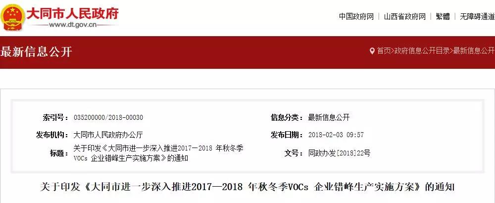 2018/02/01[閱讀原文]附:《大同市進(jìn)一步深入推進(jìn)2017—2018年秋冬季VOCs企業(yè)錯(cuò)峰生產(chǎn)實(shí)施方案》