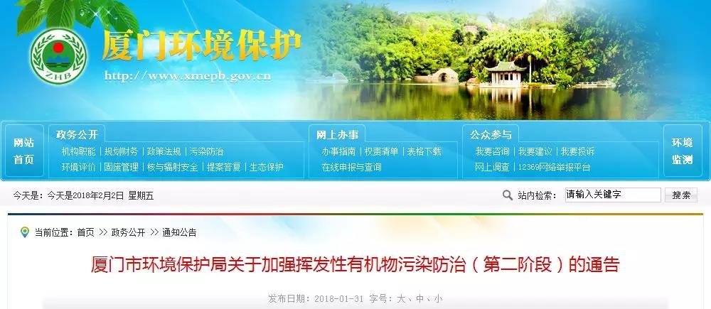 2018/02/26[閱讀原文]各有關(guān)企業(yè): 為加強(qiáng)我市揮發(fā)性有機(jī)物(以下簡(jiǎn)稱(chēng)VOCs)污染防治,提升環(huán)境空氣質(zhì)量,根據(jù)《中華人民共和國(guó)環(huán)境保護(hù)法》、《中華人民共和國(guó)大氣污染防治法》和《廈門(mén)市環(huán)境保護(hù)條例》等相關(guān)法律法規(guī)規(guī)定,結(jié)合我市實(shí)際,通告如下: