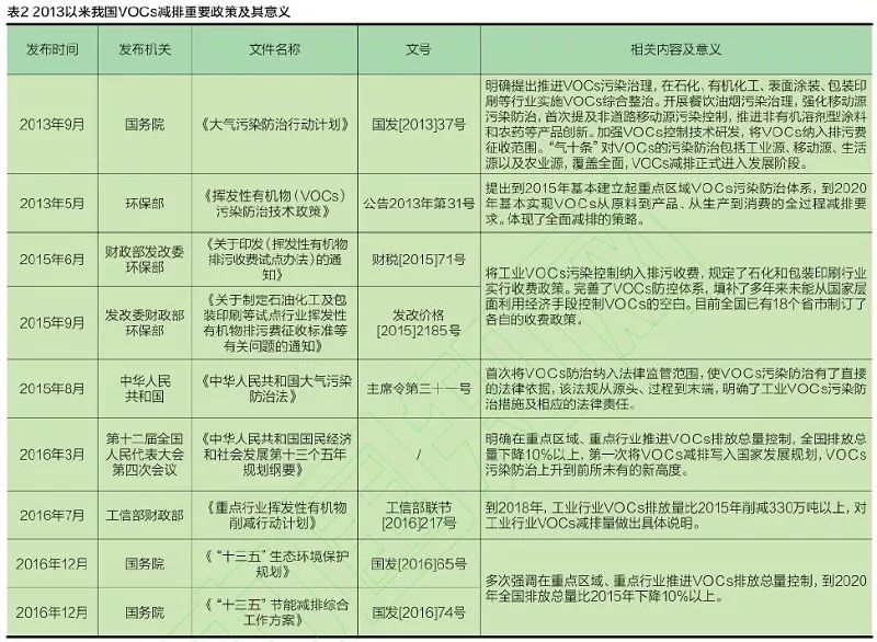 2010—2012年是國家開展VOCs減排工作的起步階段。這段時間國家VOCs減排相關(guān)政策及其意義見表1。通過2010—2012年的初步摸索,雖然圖1中我國VOCs排放總量仍然呈現(xiàn)較為明顯的增長趨勢,但是增長勢頭較2010年之前明顯減緩,說明從國家層面頒布的VOCs減排政策有效減緩了VOCs的排放量增長。但是本階段仍然存在許多問題:首先是由于長期以來,我國污染控制對象相對單一,通常僅包含二氧化硫、氮氧化物和工業(yè)煙粉塵等,VOCs存在底數(shù)不清、特征不明、控制技術(shù)及管理基礎(chǔ)薄弱的狀況,無論是減排對象的篩選、減排技術(shù)的選擇還是基層減排工作的開展都缺乏經(jīng)驗,仍需要不斷摸索,汲取經(jīng)驗。其次是VOCs排放來源廣泛,上述減排政策主要集中在工業(yè)源,對移動源、農(nóng)業(yè)源、生活源的污染控制力度顯然是不夠的。此外這一階段VOCs排放標準嚴重缺失,這也加重了基層環(huán)保部門管理的難度。 VOCs減排發(fā)展階段 2013年我國《大氣污染防治行動計劃》發(fā)布以來,各種VOCs減排相關(guān)的政策以及配套的標準、技術(shù)指南等密集出臺(見表2),VOCs減排進入發(fā)展階段。