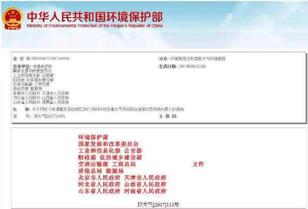 8月21日,環(huán)保部聯(lián)合發(fā)改委、工信部、公安部、財政部等11部委,以及北京市政府、天津市政府、河北、山西、山東、河南省政府發(fā)布《京津冀及周邊地區(qū)2017-2018年秋冬季大氣污染綜合治理攻堅行動方案》(下稱方案)。 《方案》回顧了2016年秋冬季,讓人觸目驚心的空氣質(zhì)量,表明了2017年絕不重蹈覆轍的決心。針對這個《方案》,進入9月份,上述部委和省政府又聯(lián)合印發(fā)了問責(zé)規(guī)定、巡查工作通知以及六個配套方案,旨在打贏這場攻堅戰(zhàn)。