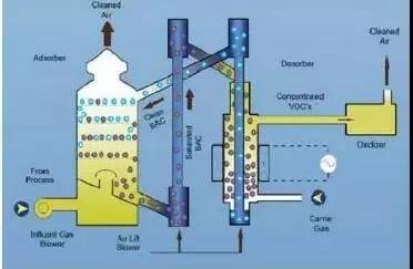 利用吸附劑(粒狀活性炭和活性炭纖維)的多孔結(jié)構(gòu),將廢氣中的VOC捕獲。將含VOC的有機廢氣通過活性炭床,其中的VOC被吸附劑吸附,廢氣得到凈化,而排入大氣。