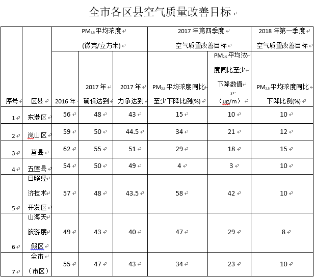 11月5日,日照市印發(fā)了《日照市2017-2018年秋冬季大氣污染綜合治理攻堅(jiān)行動(dòng)實(shí)施方案》(以下簡(jiǎn)稱《攻堅(jiān)行動(dòng)方案》),切實(shí)加強(qiáng)2017-2018年秋冬季大氣污染防治工作,最大限度降低秋冬季重污染天氣發(fā)生的頻率和時(shí)間,完成省下達(dá)的各項(xiàng)目標(biāo)任務(wù)。 為貫徹落實(shí)《山東省落實(shí)<京津冀及周邊地區(qū) 2017—2018年秋冬季大氣污染綜合治理攻堅(jiān)行動(dòng)方案>實(shí)施細(xì)則》(魯政辦字2017〕150 號(hào)),切實(shí)加強(qiáng)我市 2017—2018 年秋冬季(2017 年10 月—2018 年 3 月)大氣污染防治工作,最大限度降低秋冬季重污染天氣發(fā)生的頻率和時(shí)間,完成省下達(dá)的各項(xiàng)目標(biāo)任務(wù)。 一、主要目標(biāo) 2017 年,全市細(xì)顆粒物(PM2.5)平均濃度確保達(dá)到 47 微克/立方米,力爭(zhēng)達(dá)到 43 微克/立方米;全市二氧化氮(NO2)平均濃度達(dá)到 33 微克/立方米。2018 年 1 月至 2018 年 3 月,PM2.5平均濃度同比下降 10%以上。2017 年 10 月至 2018 年 3 月,重污染天數(shù)同比下降 10%以上,二氧化氮(NO2)連續(xù) 3 個(gè)月及以上同比改善。 二、主要任務(wù) (一)建設(shè)完善空氣質(zhì)量監(jiān)測(cè)網(wǎng)絡(luò)體系 1.加快區(qū)縣監(jiān)測(cè)網(wǎng)絡(luò)建設(shè)。2018 年 6 月底前,轄區(qū)內(nèi)所有區(qū)縣全部建成包含二氧化硫(SO2)、二氧化氮(NO2)、可吸入顆粒物(PM10)、細(xì)顆粒物(PM2.5)、一氧化碳(CO)、臭氧(O3)六項(xiàng)參數(shù)在內(nèi)的空氣質(zhì)量自動(dòng)監(jiān)測(cè)站點(diǎn),其中,縣建成 2 個(gè)以上,區(qū)建成 1 個(gè)以上,并實(shí)時(shí)對(duì)外發(fā)布信息。所有站點(diǎn)原始監(jiān)測(cè)數(shù)據(jù)實(shí)時(shí)上傳中國(guó)環(huán)境監(jiān)測(cè)總站,上傳率達(dá)到 90%以上 (市環(huán)保局牽頭,各區(qū)縣政府、管委負(fù)責(zé)落實(shí)) 2.加快區(qū)域微站監(jiān)測(cè)網(wǎng)絡(luò)建設(shè)。按照以網(wǎng)劃格、以格建站的原則,2017 年 12 月底前,在市區(qū)范圍內(nèi)基本建成區(qū)域空氣質(zhì)量監(jiān)測(cè)微站網(wǎng)絡(luò)(一期)。微站以監(jiān)測(cè)可吸入顆粒物(PM10)、細(xì)顆粒物(PM2.5)兩項(xiàng)參數(shù)為主,抽取個(gè)別微站包含二氧化硫(SO2)、二氧化氮(NO2)、可吸入顆粒物(PM10)、細(xì)顆粒物(PM2.5)、一氧化碳(CO)、臭氧(O3)六項(xiàng)參數(shù)。(市環(huán)保局、財(cái)政局牽頭,各區(qū)縣政府、管委配合) (二)加快推進(jìn)“散亂污”企業(yè)及集群綜合整治 3.加快處置“散亂污”企業(yè)。對(duì)已經(jīng)排查出的“散亂污” 企業(yè),按照“先停后治”的原則,進(jìn)行分類處置。列入淘汰類的,于 10 月底前依法依規(guī)關(guān)停取締,要做到“兩斷三清”(即斷水、斷電、清除原料、清除產(chǎn)品、清除設(shè)備),實(shí)行掛賬銷號(hào),堅(jiān)決杜絕已取締“散亂污”企業(yè)異地轉(zhuǎn)移和死灰復(fù)燃。列入整合搬遷至合規(guī)工業(yè)園區(qū)的,按照發(fā)展規(guī)模化、產(chǎn)業(yè)現(xiàn)代化的要求,限期依法進(jìn)行環(huán)境影響評(píng)價(jià),凡被環(huán)保核查出環(huán)境違法違規(guī)行為的,按相關(guān)規(guī)定從嚴(yán)處理。堅(jiān)持邊整治、邊摸排,對(duì)新排查出的“散亂污”企業(yè),責(zé)令立即停止生產(chǎn),并限期完成關(guān)停取締或進(jìn)行綜合整治。(市環(huán)保局牽頭,各區(qū)縣政府、管委負(fù)責(zé)落實(shí)) 4.統(tǒng)籌開展“散亂污”企業(yè)集群綜合整治。各區(qū)縣繼續(xù)開展拉網(wǎng)式全面排查,實(shí)行動(dòng)態(tài)更新和臺(tái)賬管理,自 2017 年 11 月 1 日起,凡存在瞞報(bào)漏報(bào)涉大氣污染物排放“散亂污”企業(yè)集群的,嚴(yán)肅進(jìn)行責(zé)任追究。對(duì)“散亂污”企業(yè)集群要實(shí)行整體整治,按照統(tǒng)一標(biāo)準(zhǔn)、統(tǒng)一時(shí)間表的要求,同步推進(jìn)區(qū)域環(huán)境綜合整治和企業(yè)升級(jí)改造。沒(méi)有達(dá)到總體整改要求,出現(xiàn)普遍性違法排污或區(qū)域環(huán)境綜合整治不到位的,實(shí)行掛牌督辦,限期整改。列入升級(jí)改造的企業(yè),按照可持續(xù)發(fā)展和清潔生產(chǎn)要求,對(duì)污染治理設(shè)施全面提升改造,達(dá)到環(huán)保要求,實(shí)現(xiàn)做大、做優(yōu)、做強(qiáng)。升級(jí)改造完成并經(jīng)由相關(guān)部門會(huì)審簽字后方可投入運(yùn)行,并向社會(huì)公告,接受社會(huì)監(jiān)督。凡被環(huán)保核查達(dá)不到要求的,本著誰(shuí)簽字誰(shuí)負(fù)責(zé)的原則,追究相關(guān)人員責(zé)任,并對(duì)違法企業(yè)依法頂格處罰。 (市環(huán)保局牽頭,各區(qū)縣政府、管委負(fù)責(zé)落實(shí)) (三)加快散煤污染綜合治理 5.不斷提高冬季清潔取暖比例,實(shí)施以電代煤、以氣代煤試點(diǎn)。各區(qū)縣結(jié)合實(shí)際,因地制宜制定以電代煤、以氣代煤工程計(jì)劃,年底前完成試點(diǎn)方案制定(每個(gè)區(qū)縣不少于 200 戶),扎實(shí)推進(jìn)試點(diǎn)工作。(市住房城鄉(xiāng)建設(shè)局牽頭,各區(qū)縣政府、管委負(fù)責(zé)落實(shí)) 6.嚴(yán)格落實(shí)高污染燃料禁燃區(qū)要求。各區(qū)縣要對(duì)照劃定的高污染燃料