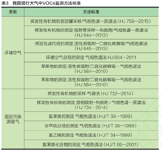 我國(guó)現(xiàn)行的《環(huán)境空氣質(zhì)量標(biāo)準(zhǔn)》(GB3095—2012)中未涉及VOCs,《室內(nèi)空氣質(zhì)量標(biāo)準(zhǔn)》(GB/T18883—2002)、《乘用車內(nèi)空氣質(zhì)量評(píng)價(jià)指南》(GB/T27630—2011)僅涉及了少量的VOCs指標(biāo),主要包括苯、甲苯、二甲苯、總揮發(fā)性有機(jī)物等。在污染物排放標(biāo)準(zhǔn)方面《大氣污染物綜合排放標(biāo)準(zhǔn)》(GB1297—1996)中對(duì)于VOCs控制,主要集中在苯、甲苯、二甲苯、氯苯幾種指標(biāo),以及VOCs和非甲烷總烴等總量指標(biāo)。在《惡臭污染物排放標(biāo)準(zhǔn)》(GB14554—93)中對(duì)廠界惡臭污染物(主要為有機(jī)含硫化合物)排放濃度制定了限值;此外在《石油化學(xué)工業(yè)污染物排放標(biāo)準(zhǔn)》(GB31571—2015)、《燒堿、聚氯乙烯工業(yè)污染物排放標(biāo)準(zhǔn)》(GB31572—2015)、《合成革與人造革工業(yè)污染物排放標(biāo)準(zhǔn)》(GB21902—2009)、《儲(chǔ)油庫(kù)大氣污染物排放標(biāo)準(zhǔn)》(GB20950—2007)、《加油站大氣污染物排放標(biāo)準(zhǔn)》(GB20952-2007)等一系列行業(yè)排放標(biāo)準(zhǔn),也對(duì)一些行業(yè)特征污染物排放限值進(jìn)行了規(guī)定。從VOCs項(xiàng)目設(shè)置上來(lái)看,主要側(cè)重于其對(duì)于人體健康和環(huán)境的直接危害,而對(duì)于作為O3重要前體物的一系列碳?xì)浠衔?、醛、酮類有機(jī)物還沒(méi)有足夠的重視。我國(guó)頒布的VOCs污染控制標(biāo)準(zhǔn)和環(huán)境質(zhì)量標(biāo)準(zhǔn)見(jiàn)表2。 我國(guó)目前的VOCs標(biāo)準(zhǔn)分析方法均為離線方法,廢氣中的VOCs多采用針筒或氣袋采樣,環(huán)境空氣則大多是針筒、氣袋、采樣罐采集或固體吸附劑吸附采樣,然后將樣品送回實(shí)驗(yàn)室采用氣相色譜法或是氣相色譜質(zhì)譜聯(lián)用法進(jìn)行分析。目前,對(duì)于環(huán)境空氣和廢氣中VOCs的在線監(jiān)測(cè)方法尚沒(méi)有形成國(guó)家標(biāo)準(zhǔn)方法。我國(guó)頒布的VOCs相關(guān)監(jiān)測(cè)分析方法標(biāo)準(zhǔn)見(jiàn)表3。