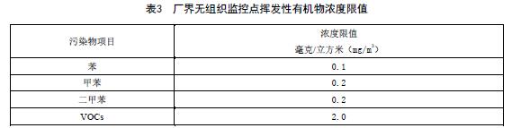 企業(yè)廠界無組織監(jiān)控點(diǎn)揮發(fā)性有機(jī)物濃度限值應(yīng)符合表3的規(guī)定。