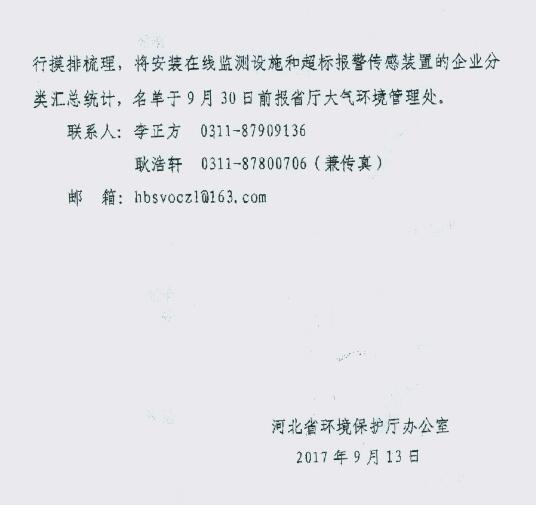 日前,保定環(huán)保局轉(zhuǎn)發(fā)河北省環(huán)保廳關(guān)于加強(qiáng)重點(diǎn)工業(yè)源揮發(fā)性有機(jī)物排放在線監(jiān)控工作的通知(冀環(huán)辦字函〔2017〕544號(hào))。全文如下: ![]()