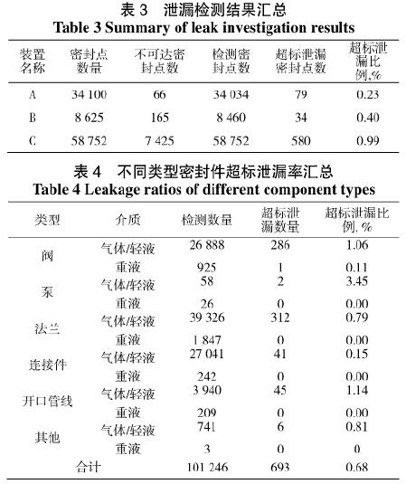 三套裝置泄漏檢測(cè)情況見表3和表4。共檢測(cè)密封點(diǎn)101246個(gè),發(fā)現(xiàn)超標(biāo)泄漏693個(gè),總體超標(biāo)泄漏比例為0.68%。超標(biāo)泄漏主要發(fā)生在氣體/輕液流經(jīng)的設(shè)備與管線組件,重液流經(jīng)的設(shè)備與管線密封點(diǎn)基本未見超標(biāo)泄漏。氣體/輕液閥、泵、法蘭、接頭、開口管線及其它密封點(diǎn)泄漏比例分別為1.06%、3.45%、0.79%、0.15%、1.14%和0.81%,泵、閥和開口管線的泄漏比例相對(duì)較高,法蘭和接頭等靜密封點(diǎn)的泄漏比例較低??紤]到閥的基數(shù)較大,且泄漏排放計(jì)算相關(guān)方程的系數(shù)較大,可能對(duì)泄漏排放量核算的貢獻(xiàn)較大。