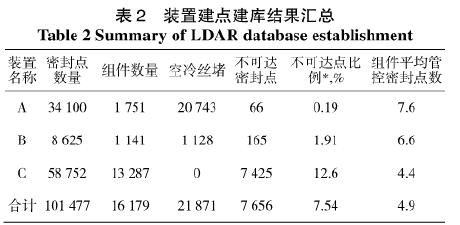 三套裝置基礎(chǔ)信息建點(diǎn)建庫結(jié)果見表2。三套裝置密封點(diǎn)總計(jì)為101477個(gè),劃分組件16179個(gè),平均每個(gè)組件控制密封點(diǎn)數(shù)約為4.9個(gè)(扣除空冷絲堵),組件劃分較為細(xì)致。三套裝置不可達(dá)(難于檢測(cè)+險(xiǎn)于檢測(cè))密封點(diǎn)共7656個(gè),占密封點(diǎn)總數(shù)的7.54%,不可達(dá)點(diǎn)認(rèn)定主因?yàn)楸夭牧习不蚋哂跈z測(cè)平臺(tái)2m以上。不可達(dá)點(diǎn)數(shù)量過多可能引起VOCs排放核算偏高,根據(jù)中國石化LDAR推廣應(yīng)用情況,現(xiàn)有煉化企業(yè)全廠不可達(dá)密封點(diǎn)比例一般可控制在10%以內(nèi)。采用延長探頭檢測(cè)高處/狹隘處不可達(dá)密封點(diǎn),在保溫材料接口處檢測(cè)保溫材料包覆的密封點(diǎn),可實(shí)現(xiàn)部分不可達(dá)密封點(diǎn)的檢測(cè)。