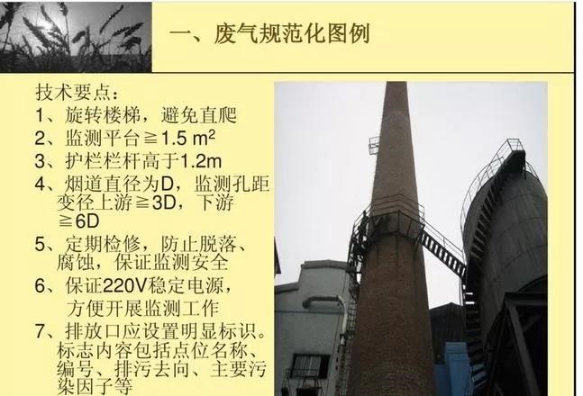 廢氣排氣筒(煙囪)規(guī)范化整治 1一類環(huán)境空氣質(zhì)量功能區(qū),如國(guó)家和省劃定的自然保護(hù)區(qū)、風(fēng)景名勝區(qū)和其它需要特別保護(hù)的地區(qū),不得新建排氣筒(煙囪)。 2 排放同類污染物的兩個(gè)或兩個(gè)以上的排氣筒(煙囪)(不論其是否屬同一生產(chǎn)設(shè)備),在不影響生產(chǎn)、技術(shù)上可行的條件下,應(yīng)盡可能合并成一個(gè)排氣筒(煙囪)。 3有組織排放廢氣的排氣筒(煙囪)高度應(yīng)符合國(guó)家大氣污染物排放標(biāo)準(zhǔn)的有關(guān)規(guī)定。達(dá)不到規(guī)定要求的,或?qū)ε欧艔U氣進(jìn)行進(jìn)一步處理,或?qū)ε艢馔玻焽瑁?shí)施整治。 4 對(duì)有破損、漏風(fēng)的排氣筒(煙囪)必須及時(shí)修復(fù)。 5無組織排放有毒有害氣體的,凡有條件的,均應(yīng)加裝引風(fēng)裝置,進(jìn)行收集、處理,改為有組織排放。新擴(kuò)改項(xiàng)目,原則上不得設(shè)置無組織排放的設(shè)施。 6 排氣筒(煙囪)應(yīng)設(shè)置便于采樣、監(jiān)測(cè)的采樣口和采樣監(jiān)測(cè)平臺(tái)。有凈化設(shè)施的,應(yīng)在其進(jìn)出口分別設(shè)置采樣口。 7 采樣孔、點(diǎn)數(shù)目和位置應(yīng)按《固定污染源排氣中顆粒物測(cè)定與氣態(tài)污染物采樣方法》(GB/T16157-1996)和《污染源統(tǒng)一監(jiān)測(cè)分析方法(廢氣部分)》([82]城環(huán)監(jiān)字第66號(hào))的規(guī)定設(shè)置。