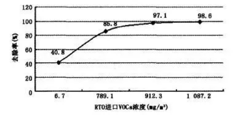 從上圖中可以看出,隨著RTO裝置進口VOCs濃度的升高,VOCs去除率逐步升高,進口濃度到達900 ms/m3時,VOCs去除率接近理論去除率(99%)。這充分說明,隨著VOCs廢氣濃度的升高,RTO裝置對VOCs的絕對去除量有保證,從VOCs的絕對去除量方面考慮,RTO裝置具有很明顯的優(yōu)越性。