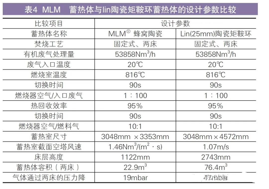 2.5蓄熱室進出口氣體溫差蓄熱室進出口氣體溫差不宜大于60℃。 2.6燃燒室高溫氣體在燃燒室的停留時間一般不宜低于0.75s,并根據(jù)停留時間確定燃燒室的容積與尺寸規(guī)格;燃燒室燃燒溫度高于760℃。燃燒器根據(jù)輔助燃料類型、燃燒室結(jié)構(gòu)、壓力、待處理廢氣流量、裝置啟動時間等因素配置,具備溫度自動調(diào)節(jié)的功能,符合GB19839的相關(guān)規(guī)定。一般來說,1萬m3的氣體可根據(jù)廢氣的熱值情況選擇25~60萬kcal的燃燒器,如處理廢氣量10000 m3,采用沼氣或天然氣等氣體燃料作為助燃劑,采用North American4425-5(25萬kcal/h)燃氣燃燒器,可調(diào)節(jié)比1∶30。如采用柴油作為助燃,采用美國NA5424-5(20萬kcal/h)燃油比例調(diào)節(jié)式燃燒器,調(diào)節(jié)比1:10。RTO裝置中使用的燃燒器主要產(chǎn)品有North American、ESApyronics、ECLIPSE、pyronics、MAXON等品牌。輔助燃料優(yōu)先選用天然氣、液化氣、輕質(zhì)柴油等清潔燃料。 2.7吹掃氣體量 吹掃氣體量一般按照處理廢氣量的10%計算,可以單獨設(shè)置風(fēng)機送新風(fēng)。 2.8閥門與切換周期 (1)固定式燃燒工藝采用切換閥(包括吹掃)選用氣動蝶閥,切換閥是固定式RTO裝置進行循環(huán)熱交換的關(guān)鍵部件,必須在規(guī)定的時間準(zhǔn)確地進行切換,且保證泄漏量?。ā?%),壽命長(可達100萬次),啟閉迅速(≤1s)。RTO裝置一般規(guī)定要求切換周期在90~180S。旋轉(zhuǎn)式分配區(qū)的廢 (2)旋轉(zhuǎn)式燃燒工藝旋轉(zhuǎn)分配閥是旋轉(zhuǎn)式燃燒工藝的核心部件,采用回轉(zhuǎn)式空氣分配閥。具體可根據(jù)設(shè)計處理風(fēng)量、風(fēng)壓、風(fēng)嘴數(shù)量和閥芯轉(zhuǎn)速要求來選擇合適的空氣分配閥。 3保溫耐火材料 要求質(zhì)量輕、導(dǎo)熱系數(shù)低(常溫下導(dǎo)熱系數(shù)低于0.03W/(m·k)、抗熱震性好、化學(xué)穩(wěn)定性強。一般情況下,裝置的燃燒室及蓄熱室內(nèi)保溫可采用耐火硅酸鋁纖維,其耐熱可達1200℃,絨重為220kg/m3。鋪設(shè)時,燃燒室及蓄熱室上部厚≤225mm,蓄熱室進出風(fēng)區(qū)厚≤120mm。保溫層一般設(shè)三層,其中含兩層硅酸鋁纖維氈及一層硅酸鋁纖維模塊。硅酸鋁纖維模塊內(nèi)設(shè)置耐熱鋼骨架,用錨固件固定在裝置殼體上。 4后處理要求 處理含氮有機物造成煙氣氮氧化物排放超標(biāo)時,采用選脫硝工藝進行后處理。當(dāng)處理含硫或含鹵素有機物產(chǎn)生二氧化硫、鹵化氫時,采用吸收等工藝進行后處理。 5安全措施要求 ① 當(dāng)廢氣濃度波動較大時,在前端采取稀釋、緩沖等措施。 ② 需在RTO裝置與主體生產(chǎn)裝置之間的管道系統(tǒng)中安裝阻火器或防火閥。當(dāng)進風(fēng)、排風(fēng)管道采用金屬材質(zhì)時,采取法蘭跨接、系統(tǒng)接地等措施,防止靜電產(chǎn)生、積聚。 ③ 應(yīng)具有過熱保護功能,保溫設(shè)計符合SGBZ-0805的相關(guān)規(guī)定。 ④ 燃料供給系統(tǒng)設(shè)置高低壓保護和泄漏報警裝置;設(shè)安全可靠的火焰控制系統(tǒng)、溫度監(jiān)測系統(tǒng)、壓力控制系統(tǒng)等。燃燒器點火操作應(yīng)符合GB19839的相關(guān)規(guī)定。 ⑤ 管路系統(tǒng)和蓄熱燃燒裝置的防爆泄壓設(shè)計應(yīng)符合GB50160的相關(guān)規(guī)定。壓縮空氣系統(tǒng)設(shè)置低壓保護和報警裝置。風(fēng)機、電機和置于現(xiàn)場的電氣儀表等設(shè)備應(yīng)防爆,等級應(yīng)不低于現(xiàn)場級別。 ⑥ 具備短路保護,接地電阻應(yīng)小于4Ω。安裝符合GB50057規(guī)定的避雷裝置。 6設(shè)計案例 美國藍太克產(chǎn)品有限公司將MLM®蓄熱體用于RTO的設(shè)計參數(shù)與lin陶瓷矩鞍環(huán)的進行了比較,如表4所示。